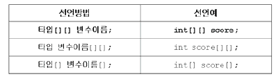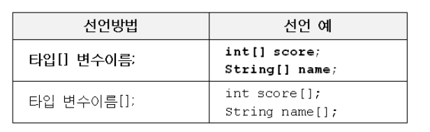 - 원하는 타입의 변수를 선언하고 대괄호[]를 붙임