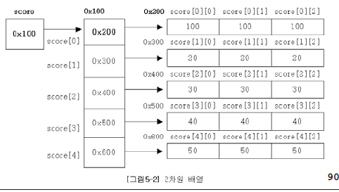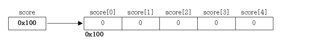 // 5개의 int 값을 저장할 수 있는 배열을 생성 -> 0x100에 5개의 int 공간 만들고 주소값을 score에 저장