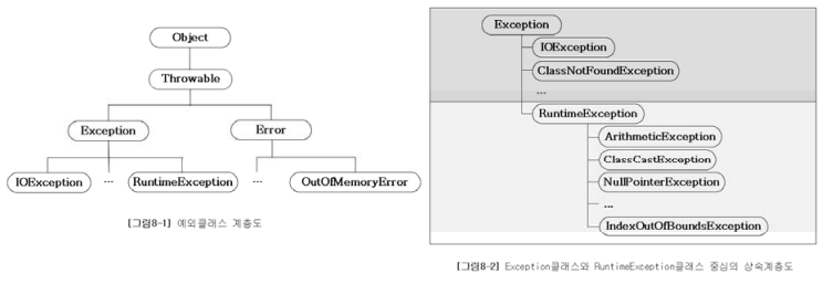 예외 : 프로그램 코드에 의해서 수습될 수 있는 다소 미약한 오류