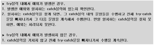 => try블럭에서 예외가 발생하면, 이후의 코드는 수행되지 않으므로