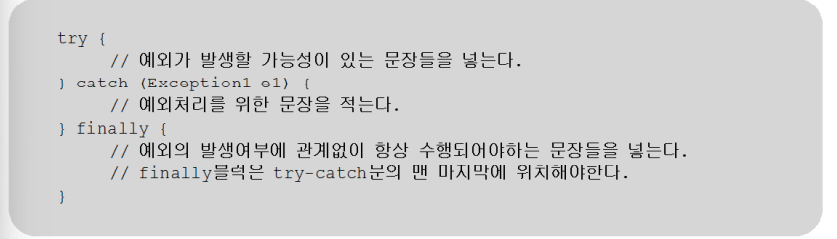 - 주로 try와 catch블럭에 공통적으로 들어가하는 부분을 포함
