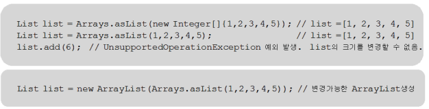 => but, asList가 반환한 리스트의 경우, 크기를 변경할 수가 없음(추가/삭제가 불가함)