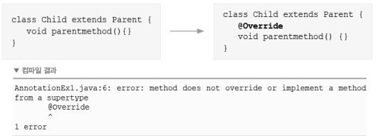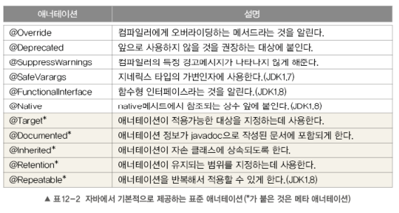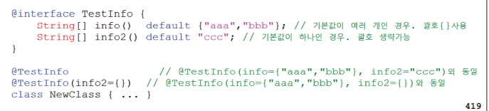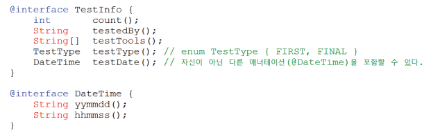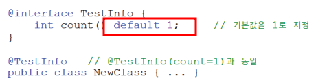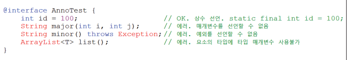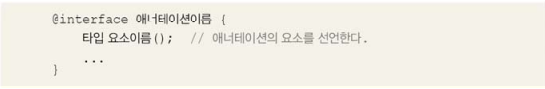 - 애너테이션의 메소드는 추상메서드이며, 적용할 때 모두 지정해야 함
