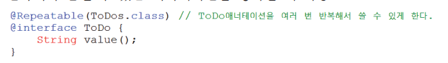 - 반복 애너테이션을 묶어서 관리할 수 있는 다른 애너테이션도 추가로 정의해야 함