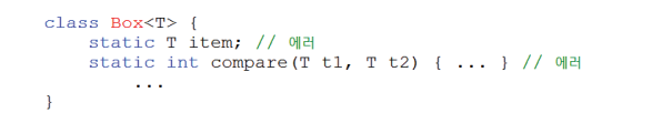 - static 멤버에 T사용 불가 : 모든 객체에 대해 동일해야 하는데 변수가 다르기 때문