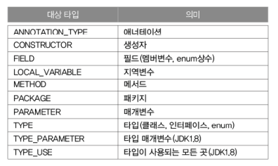 - RUNTIME : 실행시에 사용 가능한 애너테이션의 정책