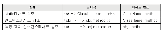 여기서 메서드 참조는 `클래스 이름::메서드 이름` 혹은 `참조변수::메서드이름`의 형식을 가진다.
