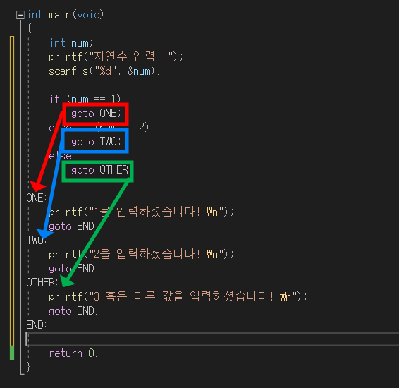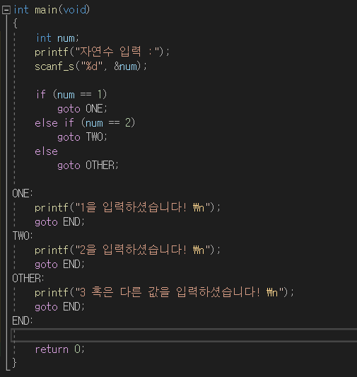 goto문 : 프로그램의 흐름을 원하는 위치로 이동시킬 때 사용