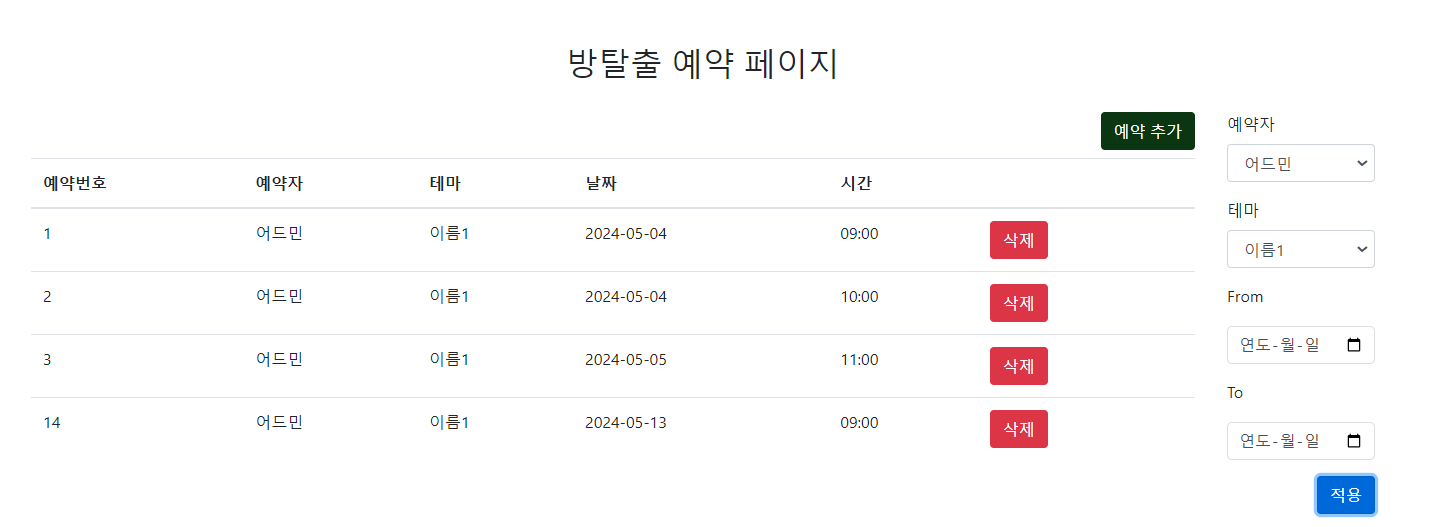 그러나, 테마 이름과 시작날짜 2024-05-01만 입력하면, 해당 테마의 예약이력 중 5월 1일 이후의 이력만을 가져와야 했다.