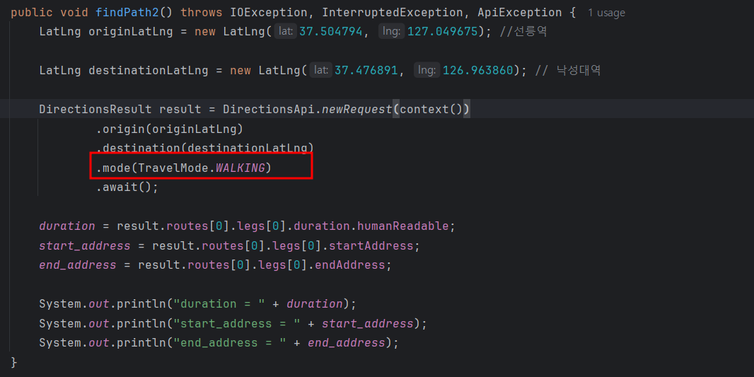 가령 앞서 선릉 -> 낙성대 길찾기 모드를 WALKING으로 바꾸고 다시 findPath2를 호출해보자