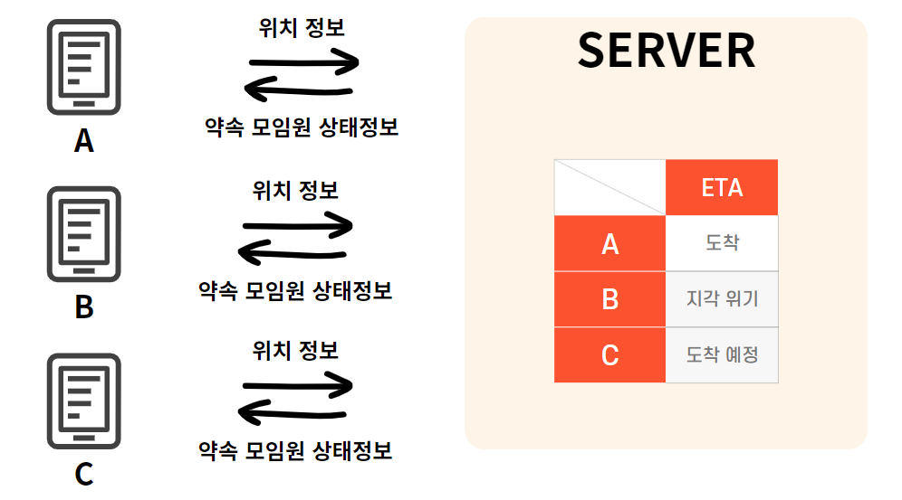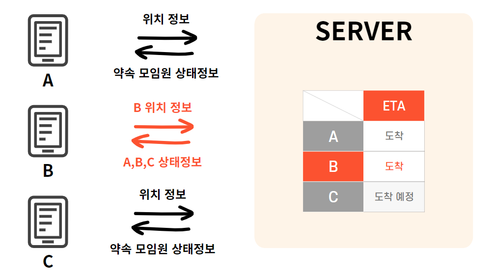 - 화면 동기화 : 약속 참여자들이 동시에 같은 도착 예정 정보를 보아야 한다.