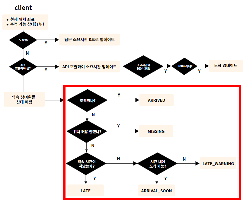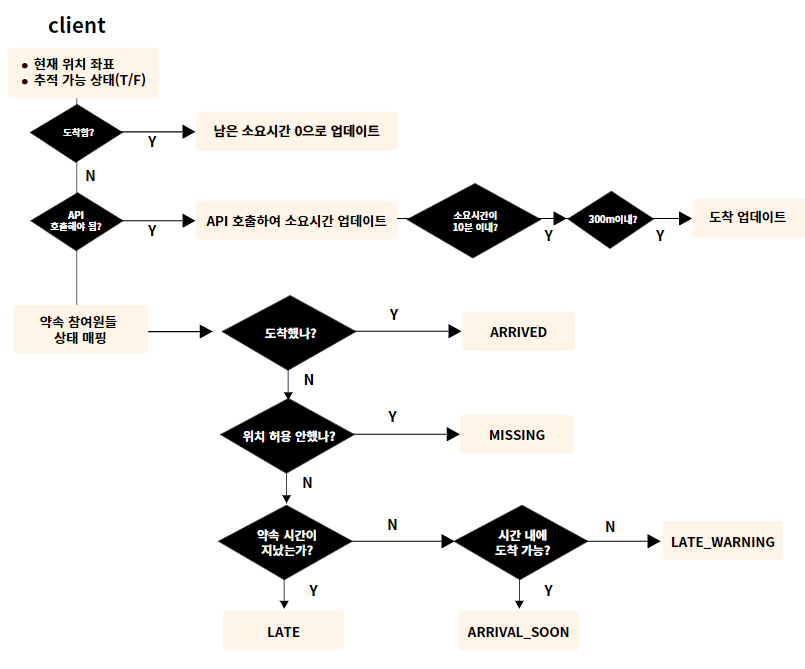 - 약속 정보 화면 동기화를 위해 약속 30분 전부터 10초 간격으로 도착 정보를 요청하는 폴링이 시작됩니다.