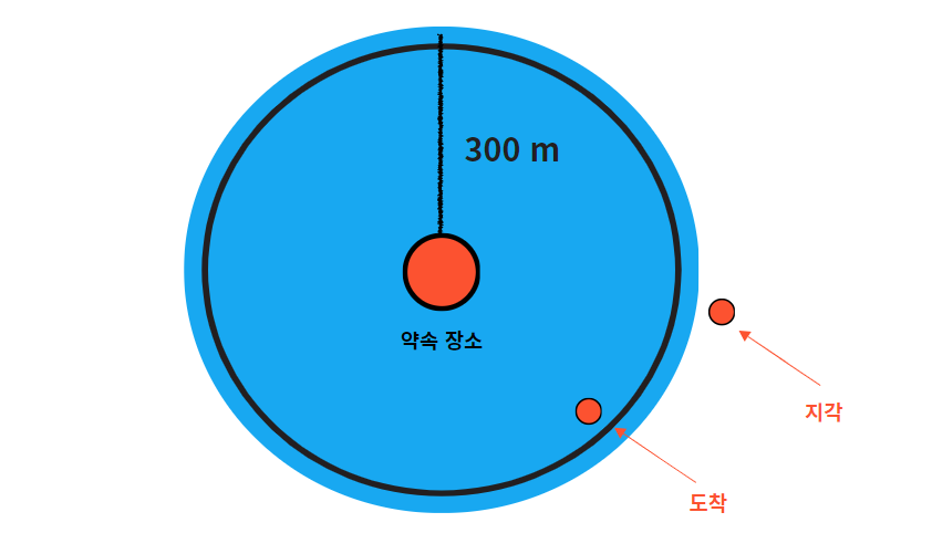 - 약속 장소까지의 위경도 직선거리가 300m 반경 안으로 들어오면 도착으로 취급합니다.