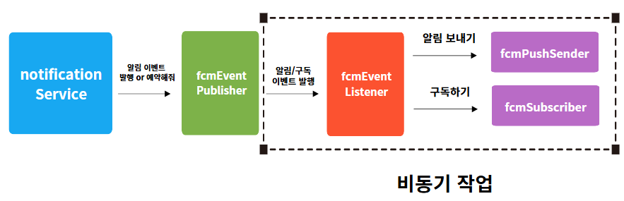 3. fcmEventListener가 발행된 이벤트를 받아 fcmPushSender나 fcmSubscirber에게 작업을 위임합니다.