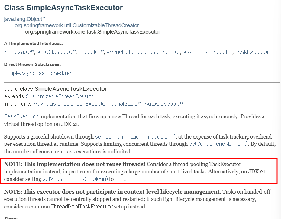 이를 고려하여 Spring Boot는 TaskExecutionAutoConfiguration에서 TaskExecutor에 대한 기본 설정을 ThreadPoolTaskExecutor로 등록하고 있습니다. 즉 SpringBoot 환경에서는 SimpleAsyncTaskExecutor가 아닌 default ThreadPoolTaskExecutor 환경에서 비동기 메서드가 실행됩니다.
