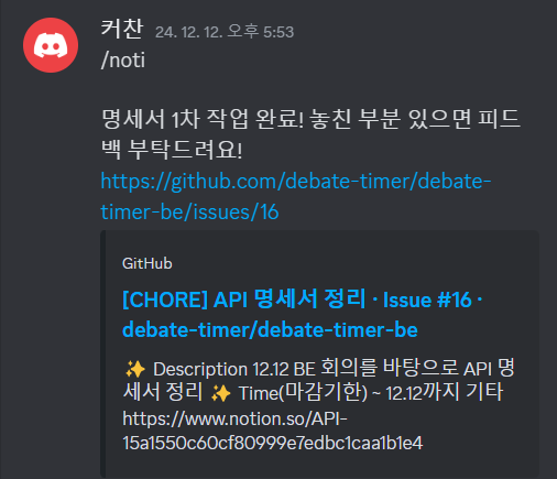 - 코드 리뷰를 남기거나 반영했을 때 /noti 웹훅으로 리뷰 여부를 남긴다.