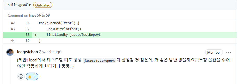 굉장히 좋은 제안이라 생각했던 이유는 도메인이 커짐에 따라 test가 많아지며 한번 test를 돌릴 때 계속해서 report가 갱신되다보니, test를 돌리기까지의 시간이 늘어나는 경험을 했었기 때문입니다. 또한 애초에 jacoco를 도입하자고 주장했던 이유가 매 test마다 report를 확인하기 위해서가 아닌, CI 과정에서 검증된 코드를 통합하기 위함이었기 때문에 local 환경에서 report 발행이 필요하지 않다는데 동감했습니다.