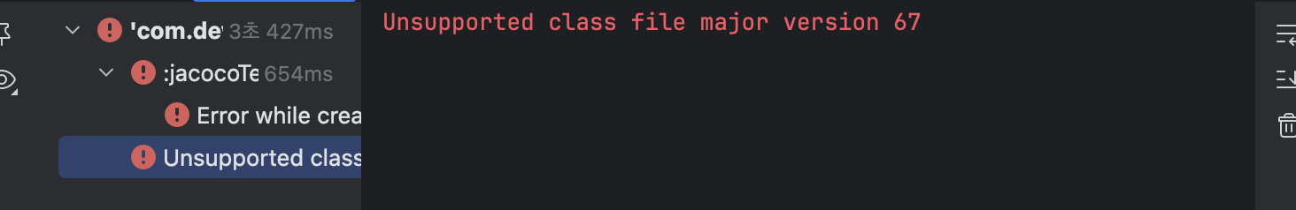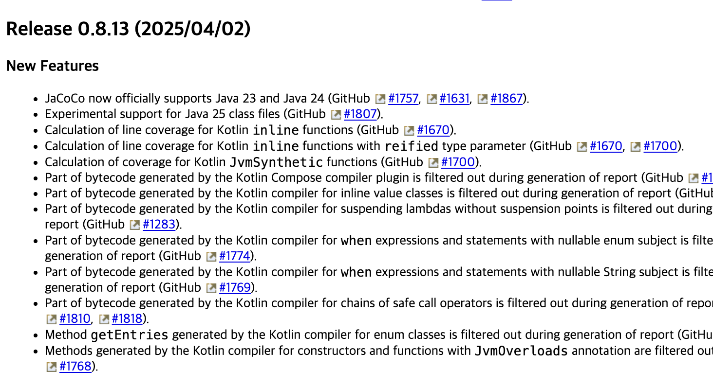 또한 jacoco 버전 0.8.13이상이어야 Java 23버전과 잘 호환되었다.