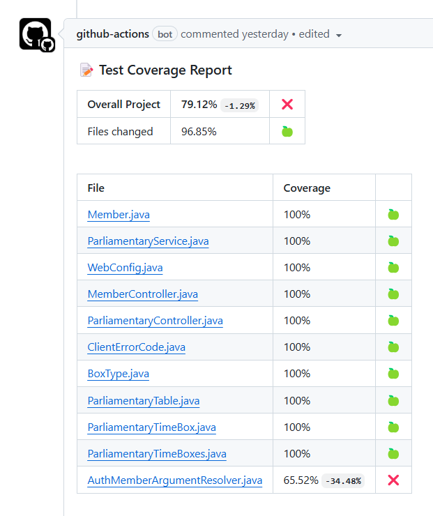 예를 들어 PR 하나 당 다음과 같은 테스트 커버리지 리포트가 comment로 달리게 됩니다.