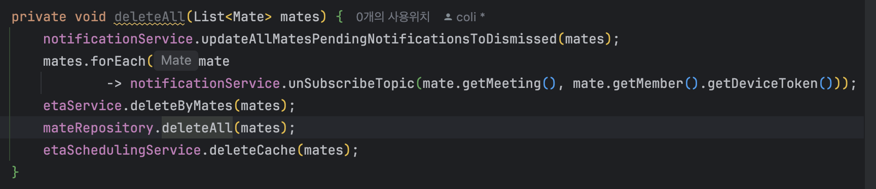 약속 참여자의 도착예정정보(Eta)와 Mate의 경우도 각각 deleteAllByMateIn과 deleteAll로 바꾸었습니다.
