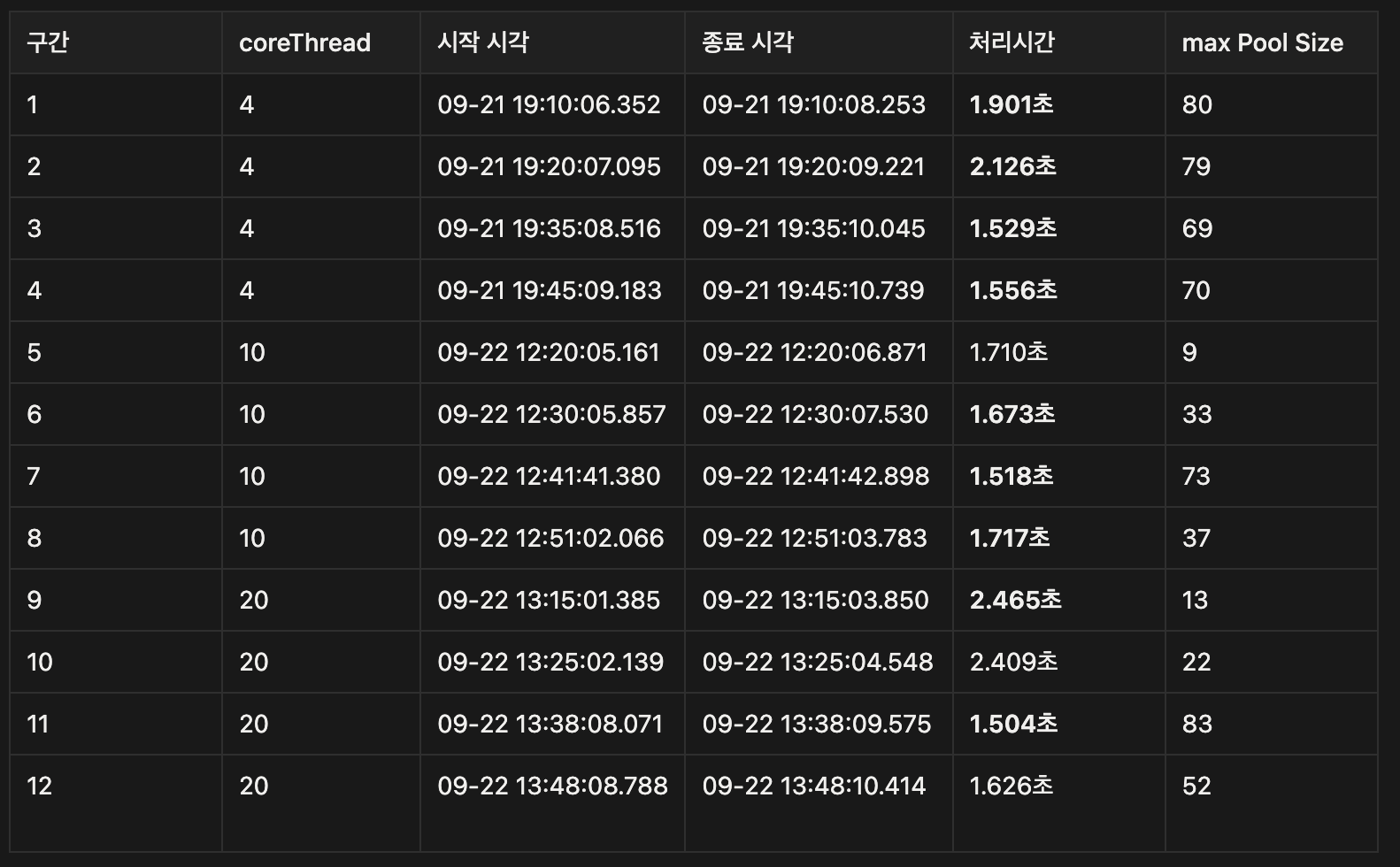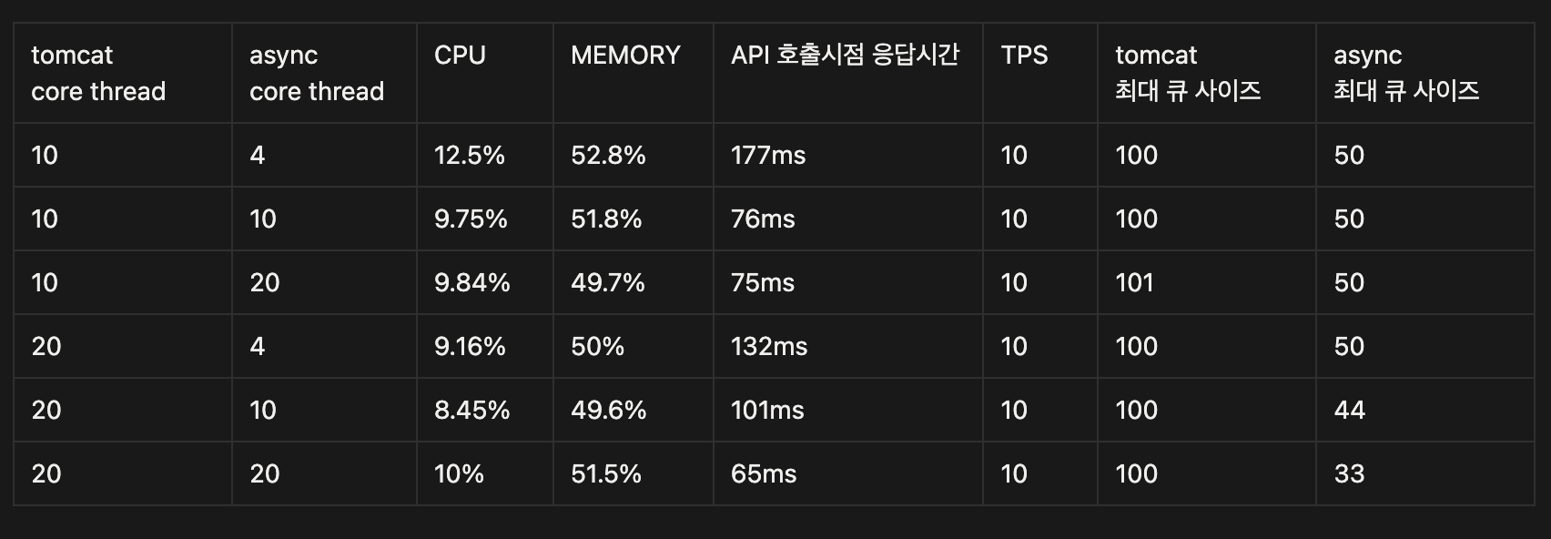 - Async Thread Pool의 core Thread는 4- 10- 20으로 실험해본 결과 10개가 가장 짧은 처리시간과 pool size peek를 보임