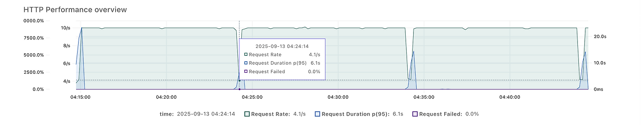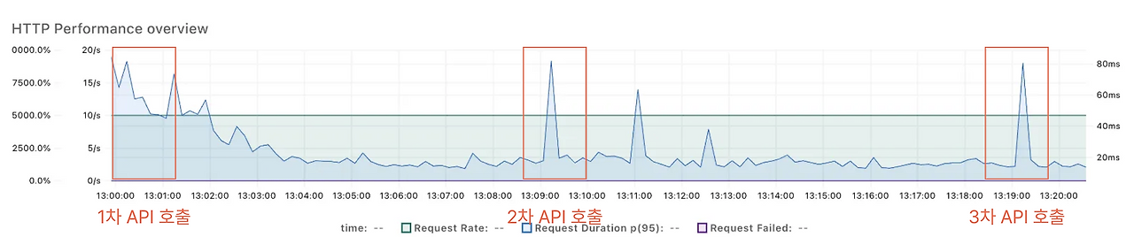 - 10-13s 되는 외부 API 응답 속도 : 10분 간격으로 외부 API 호출시점에 요청 시간이 10-13s 정도로 매우 느려짐