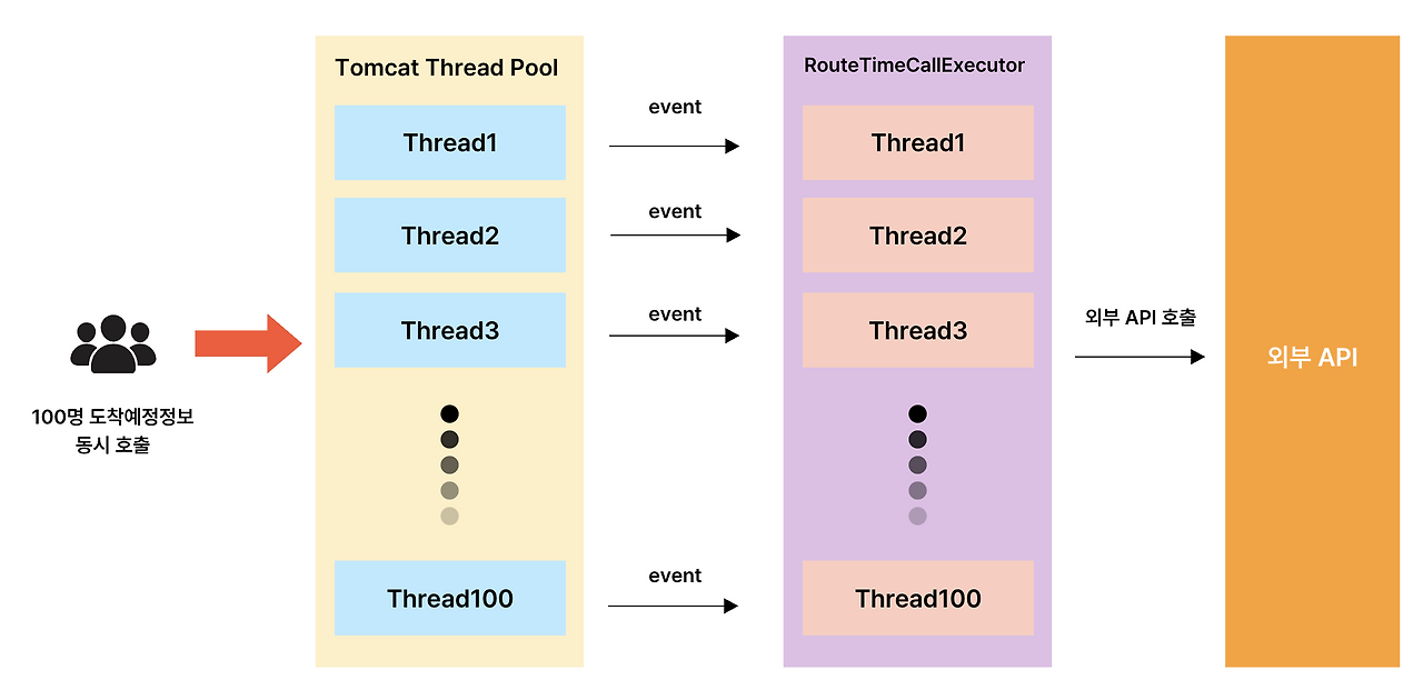 약속 화면에서 어떤 참여자는 업데이트된 결과를 빠르게 보여주는 반면, 다른 약속 참여자들은 약 몇 초 뒤에 업데이트 된 결과를 받아볼 수 있게 되었습니다. 외부 API 호출 시 태스크를 담당하는 비동기 스레드풀 최적화의 필요성을 느꼈습니다.