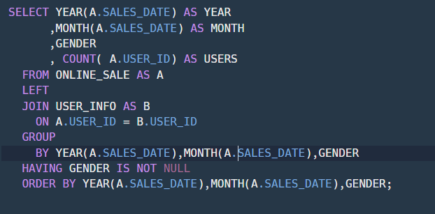 1. 년, 월, 성별 별로 상품을 구매한 회원수를 집계하는 SQL문을 작성해주세요.