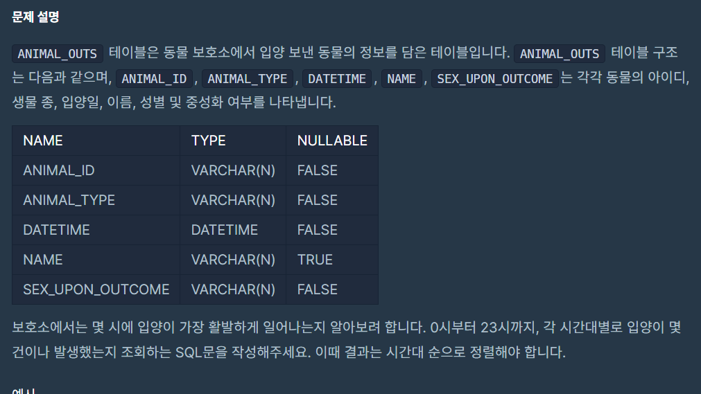 문제 설명 ANIMAL_OUTS 테이블은 동물 보호소에서 입양 보낸 동물의 정보를 담은 테이블입니다. ANIMAL_OUTS 테이블 구조는 다음과 같으며, ANIMAL_ID, ANIMAL_TYPE, DATETIME, NAME, SEX_UPON_OUTCOME는 각각 동물의 아