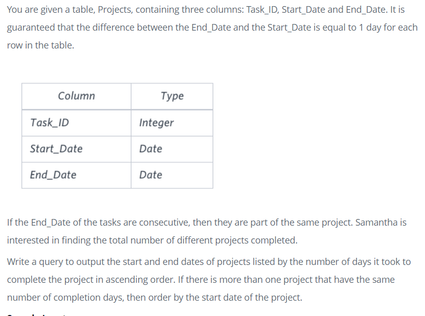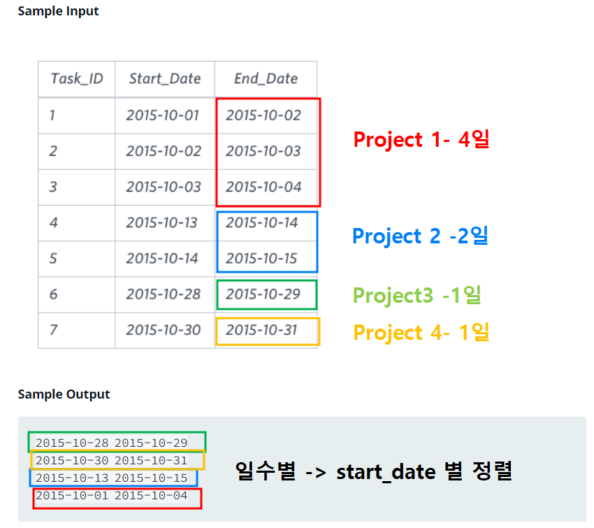 => Project table이 주어지고, task_id, start_date, end_date가 주어짐