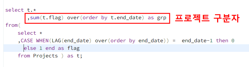 => flag를 더해내려오면서 연속된 행은 0이기 때문에 각 프로젝트 구분자가 생성