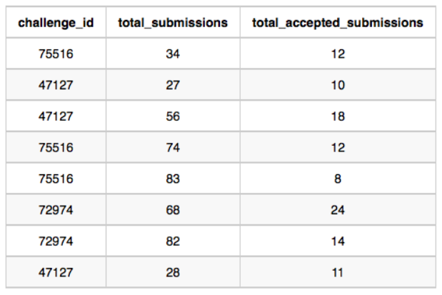 따라서 위의 두 테이블을 challenges 테이블의 challenge_id를 키로 결합해준다.