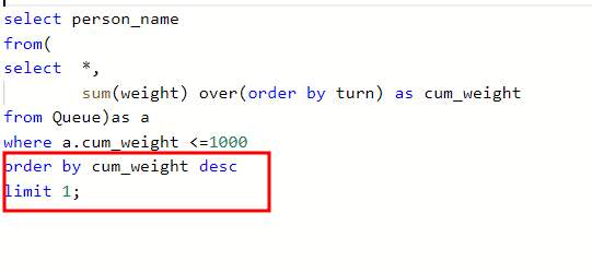 - 위의 테이블을 다시 서브쿼리에 넣고 cum_weight max값을 조회하여 이름을 찾을 수 있음