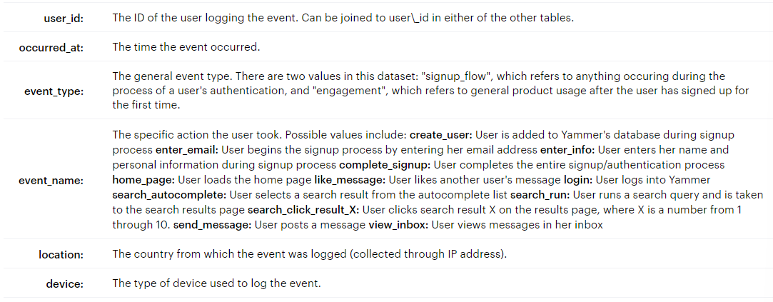 테이블2. events 테이블(tutorial.yammer_events)