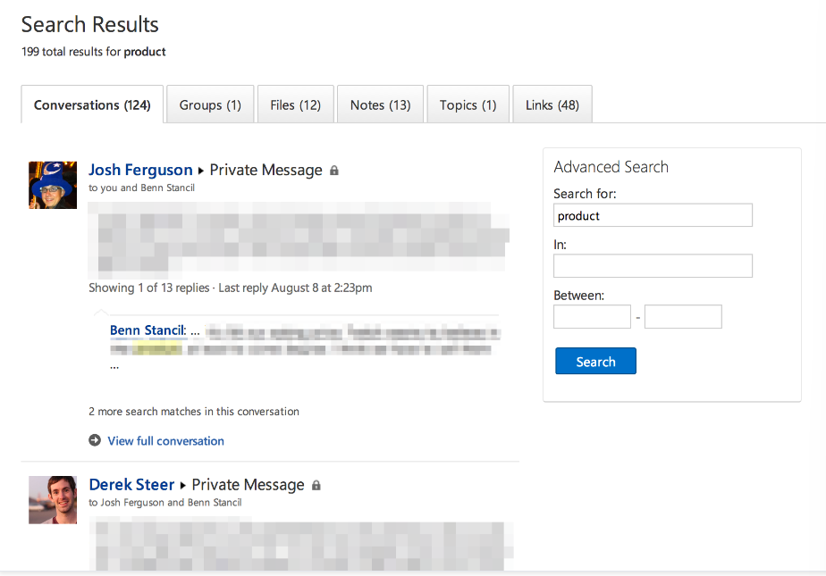 - result page 안에는 group, contersations 등 카테고리 tab별 결과 게시