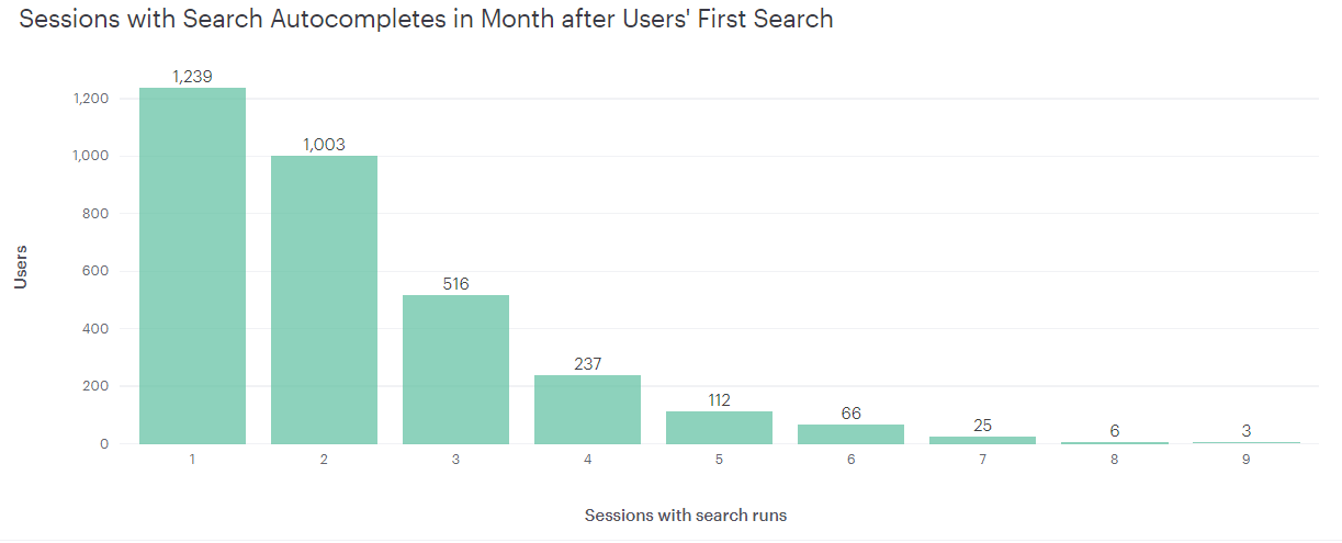 - autocomplete 최초 사용 이후 한달 내 1회 재사용 유저는 1239명, 2회 사용 유저는 1003명