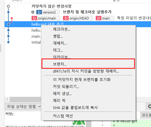- 과거의 커밋으로부터 브랜치를 생성해서 작업을 한 경우