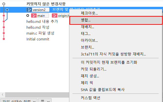 - 합치려는 브랜치가 헤드 브랜치로부터 파생